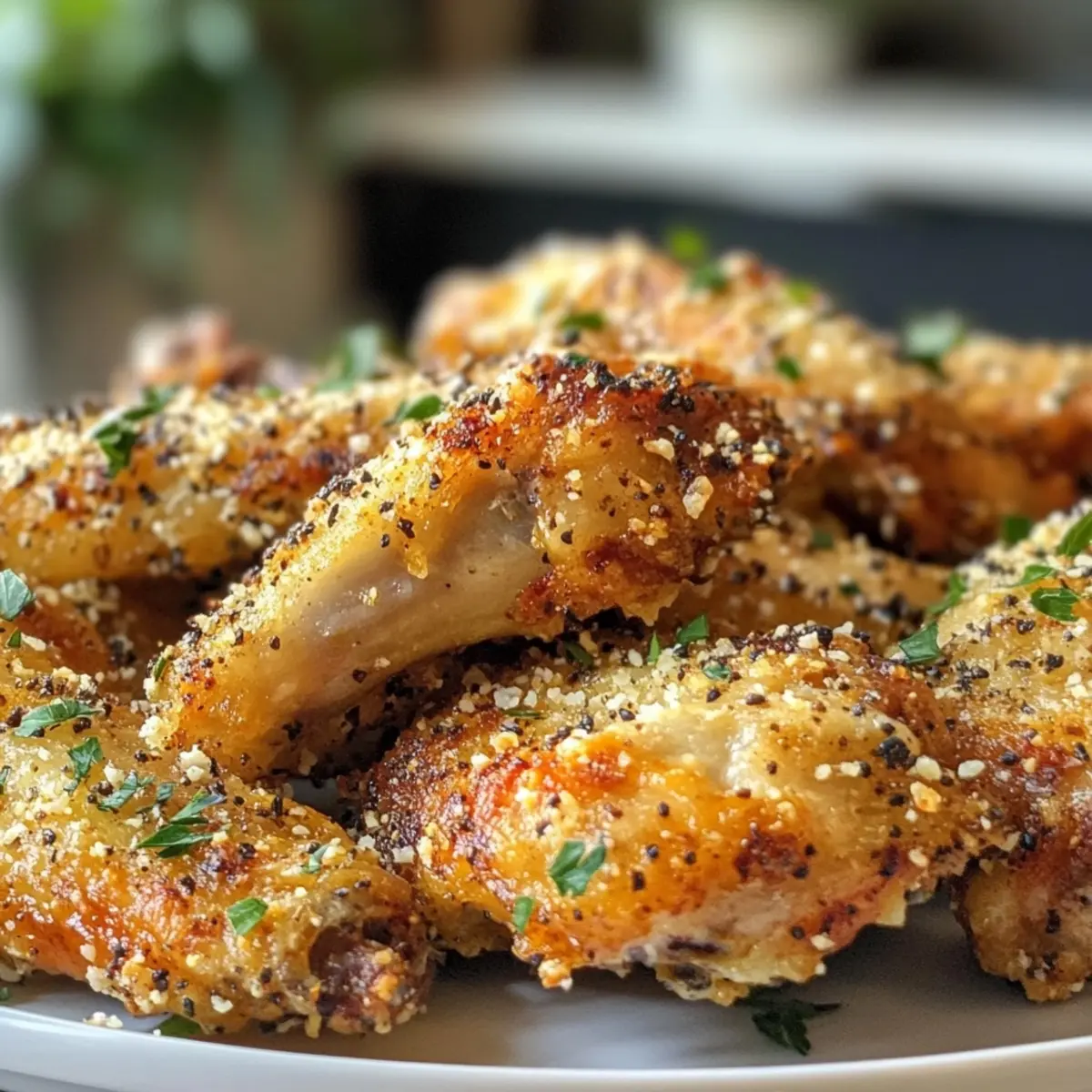 - Once perfectly crispy, plate the wings and garnish with extra parmesan cheese and optional fresh parsley.