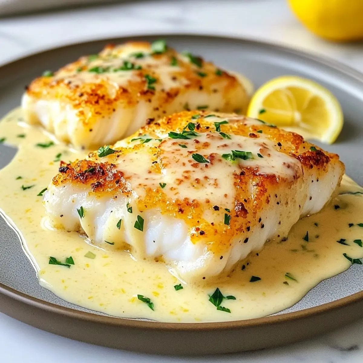 - Place the seasoned cod fillets in a baking dish and pour the creamy sauce over the top.