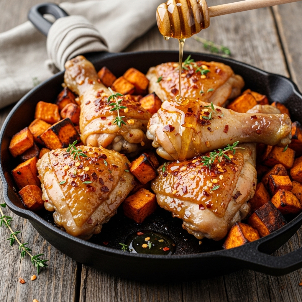 Keywords: Substitute sweet potatoes with carrots or Brussels sprouts for variety. For enhanced flavor, marinate the chicken in the hot honey sauce for up to an hour before cooking.