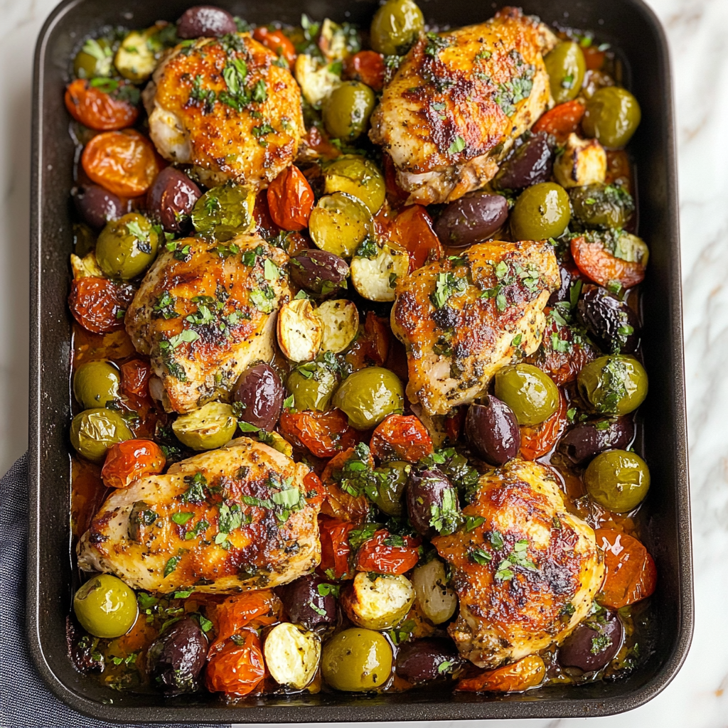 Sheet Pan Mediterranean Chicken with Olives and Feta is a colorful, flavorful dish that brings the essence of the Mediterranean to your table. This easy one-pan meal features juicy chicken breasts roasted alongside vibrant bell peppers, sweet cherry tomatoes, and briny Kalamata olives, all topped with creamy feta cheese and a zesty lemon dressing. Perfect for busy weeknights or entertaining friends, this dish promises to delight your taste buds with every bite.