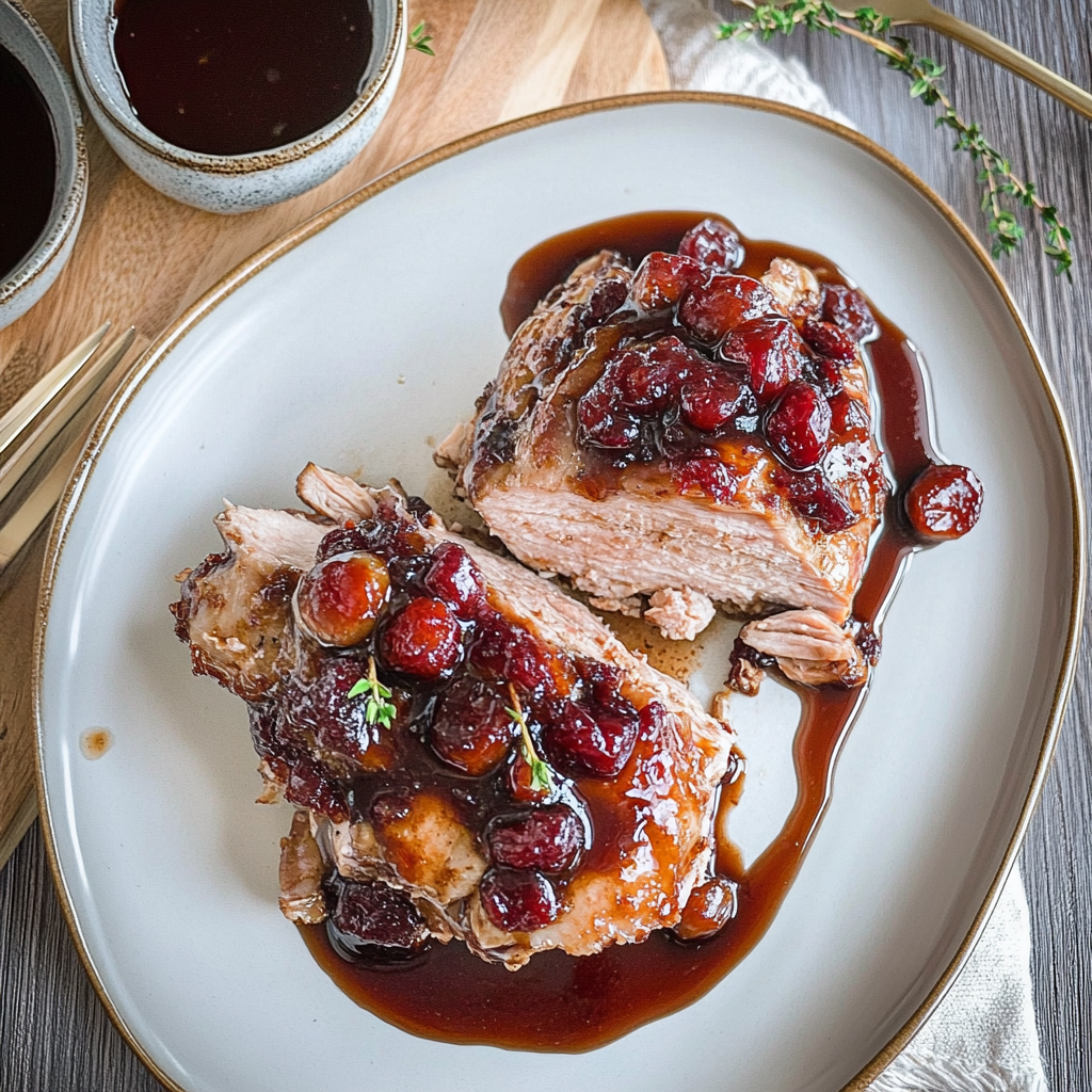 Keywords: - Searing the pork before adding it to the slow cooker enhances flavor. - For a twist, substitute cranberries with cherries or add herbs like rosemary or thyme for extra depth. - Leftovers can be stored in an airtight container in the fridge for up to four days.