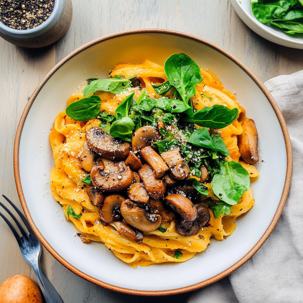 Irresistible Vegan Pumpkin Pasta with Spinach & Mushrooms